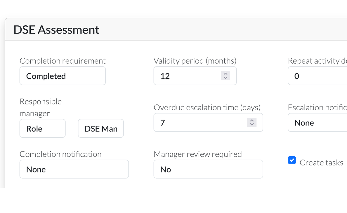You choose the balance between safety and effort that is right for your organization. Choose how frequently staff should perform training and carry out assessments. Choose the balance between manager involvement and self-assessment. Configure links to internal policies and procedures for issues that can be easily resolved.